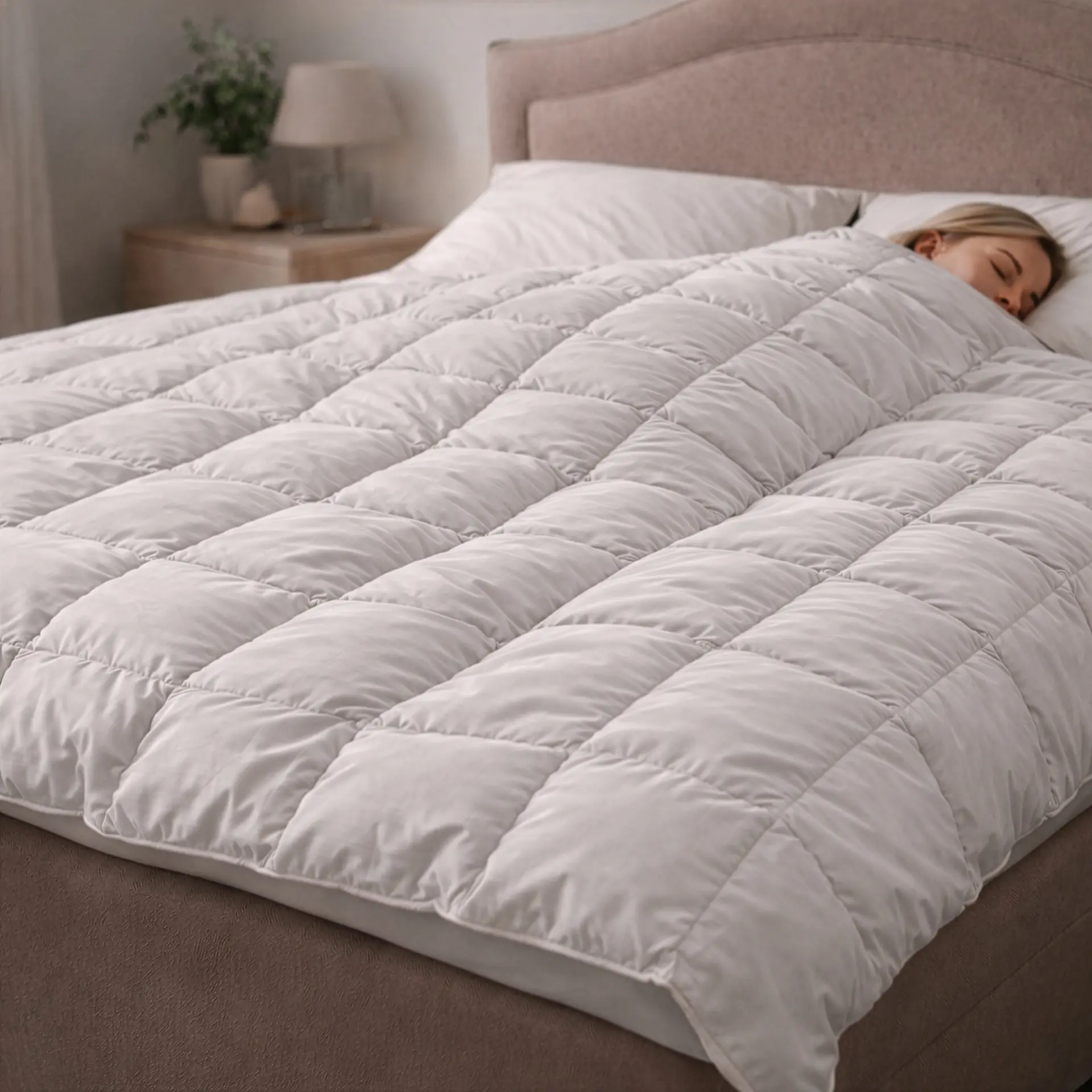 Je merkt dat het warm is, maar nooit benauwd. Het dekbed beweegt soepel met je mee wanneer je draait en blijft stil en stabiel liggen. Geen koude plekken, geen opgehoopte hitte — alleen een constante, behaaglijke, warmte die de hele nacht hetzelfde aanvoelt.