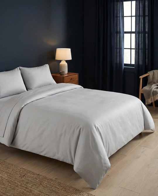 Hotelzachte rust voor elke nacht, uitgevoerd in zacht zilvergrijs katoensatijn met een verfijnde uitstraling.